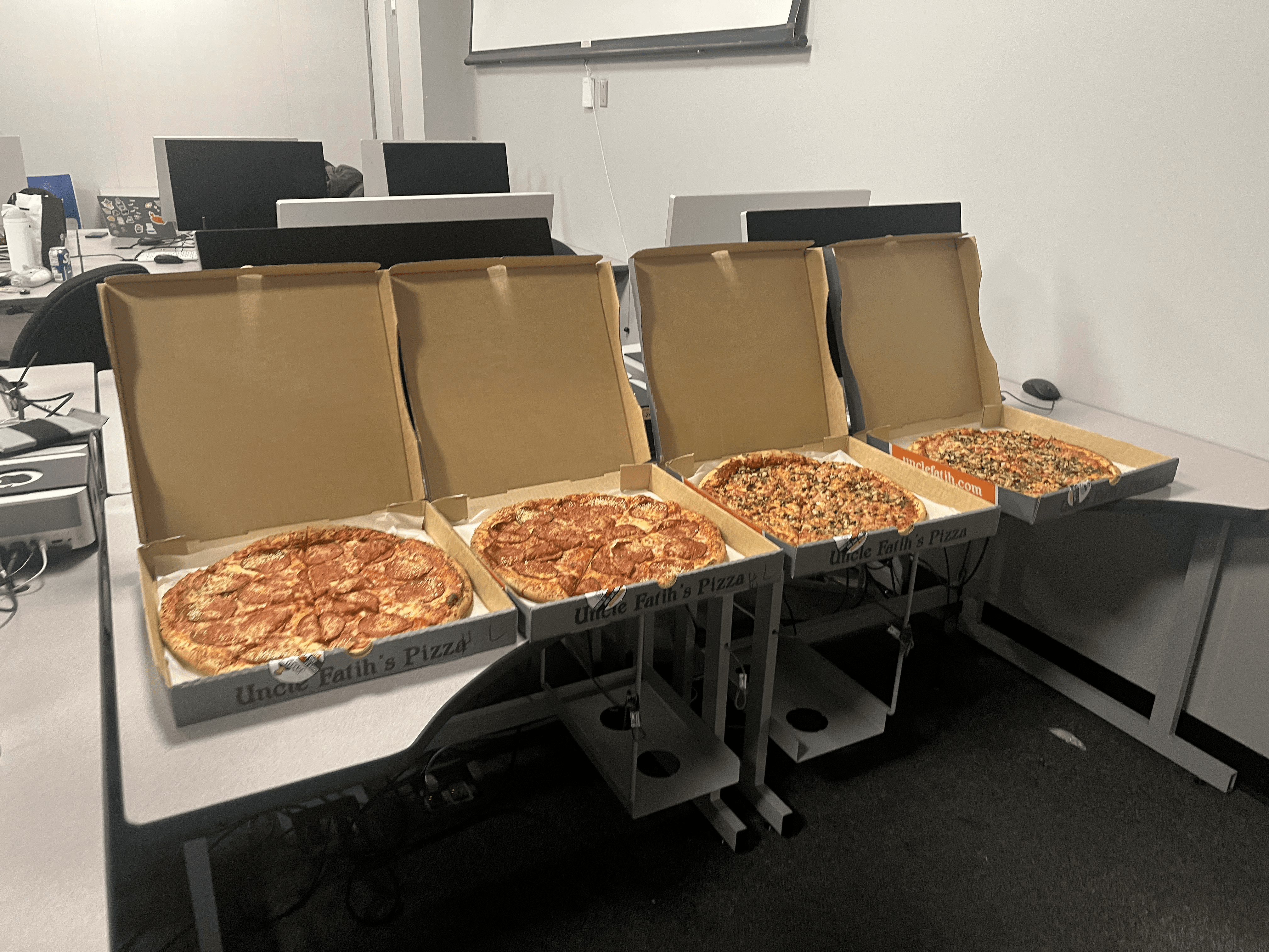 Then came the best part: Henry surprised us by bringing pizza for everyone. As soon as the boxes showed up, the whole vibe in the room changed. Laptops were pushed aside for a moment, people leaned back, and the energy turned from “school project mode” into “friends hanging out after a big milestone.” We ate, laughed, and shared our favourite (and funniest) moments from presentation day, the nerves before going up, the parts we accidentally improvised, and the little tech glitches only we noticed.